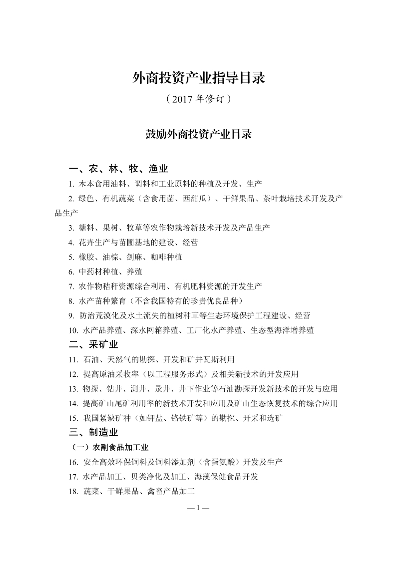 外商投资产业指导目录(2017年修订)